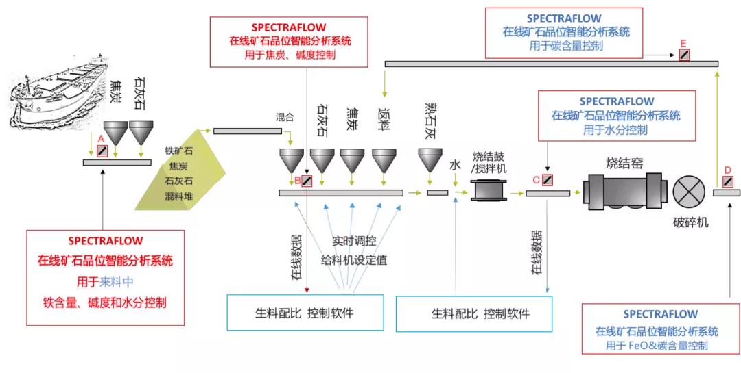 SpectraFlow在线矿石品位智能分析系统实时检测分析物料成分,并自动控制调整相关参数,克服了传统检测方法的不足,是实现智能制造、降本增效的有效途径。他除了可以控制混料碱度之外,它对于监测物料品位、水分。碳、氧化亚铁等的含量的调控,也起着关键的作用(如下图,ABCDE即为系统的可安装位置),同时JFE钢厂中也有在其他位置的安装实例,本文篇幅所限,暂只为大家呈现一个碱度控制的结果示例。